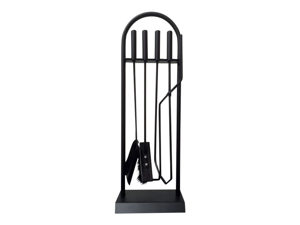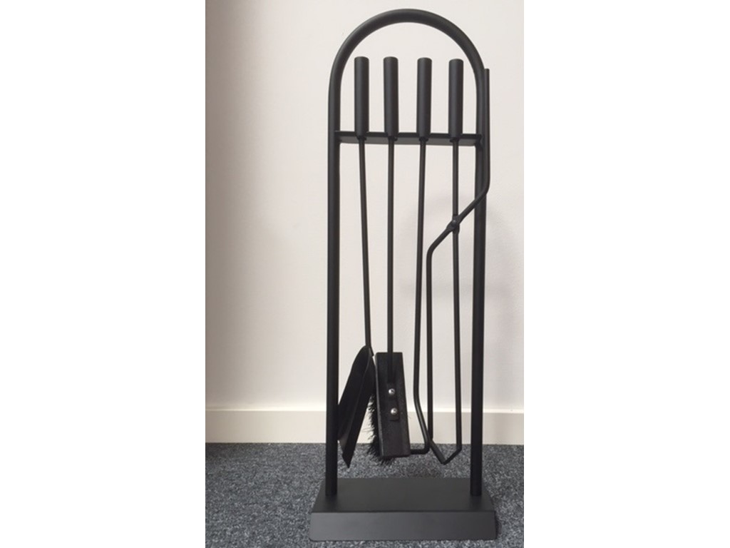 Deze set bestaande uit pook, schep, bezem en houttang met zwarte handgrepen.